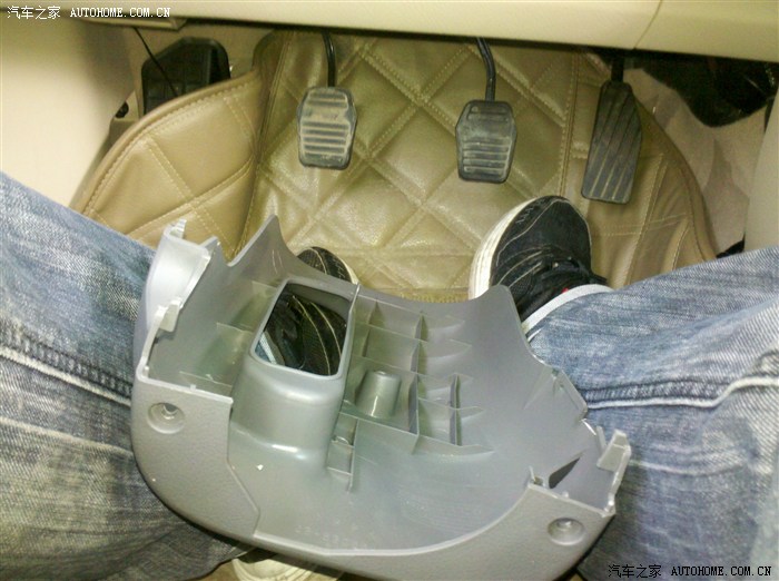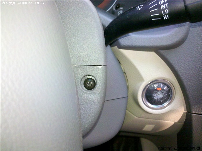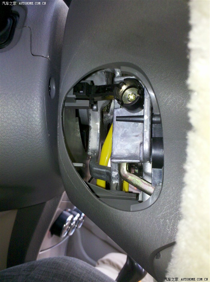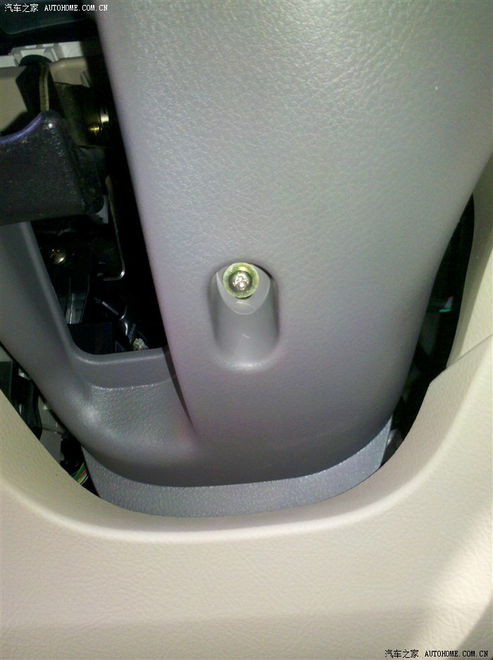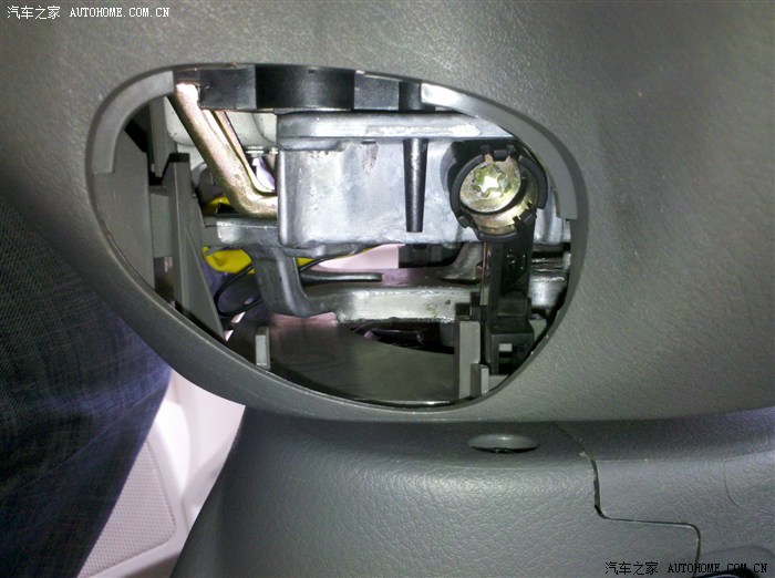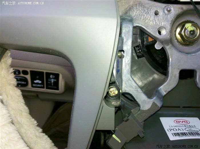 接下来拆方向盘下面的护板,以露出另一主角,方向盘下面的一个小点的插头。这护板我们在换高配组合开关时也会拆掉。转动方向盘,左右两边各一枚镙丝