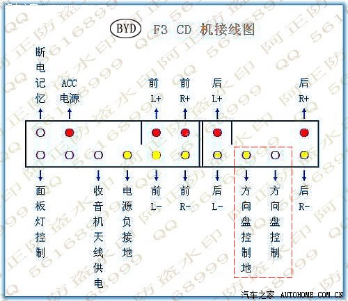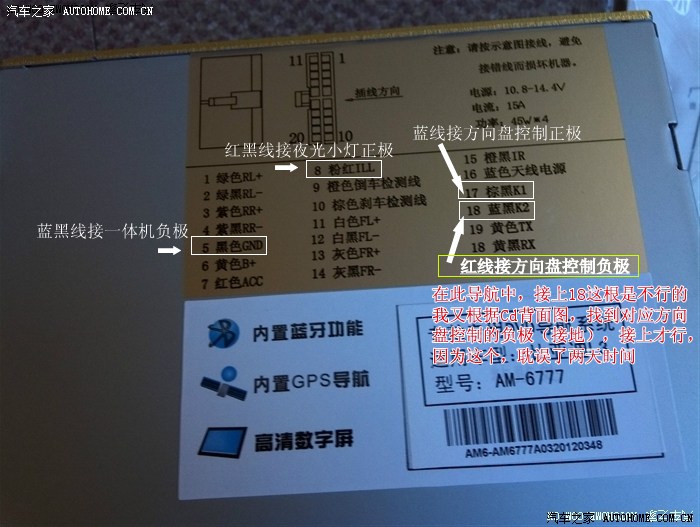 一体机负和小灯线很简单就找到了,方向盘控制也确定在17和18两根。但按照别人贴子的理解,开始接上这两根怎么都无法设置,方向盘小灯可以亮,但按键没反应,心想可能是控制线没接对,但却一头雾水的不知如何接才是正确的。后来查资料才想起找到原车拆下的Cd,看后面接口找对应方向盘控制线