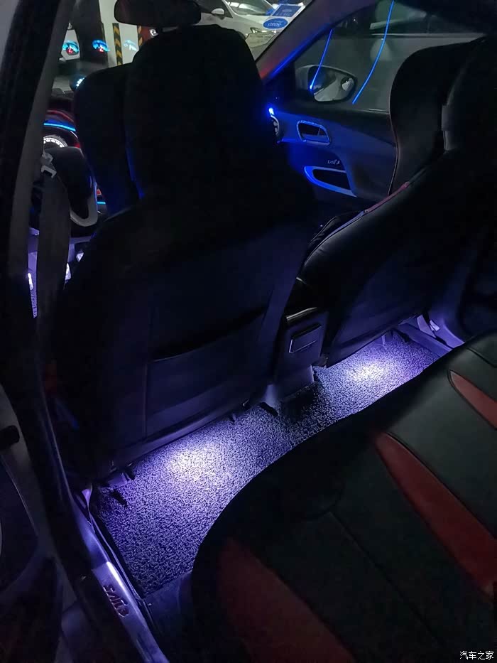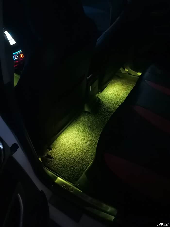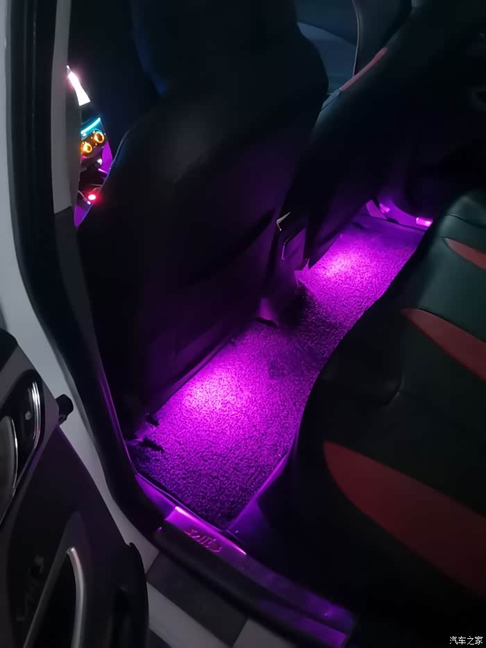3.加装脚底氛围灯,也是各种颜色可调也可以自动变光,包括主驾驶副驾驶还有后面两盏灯,一共四盏灯,安装走线也都很简单。