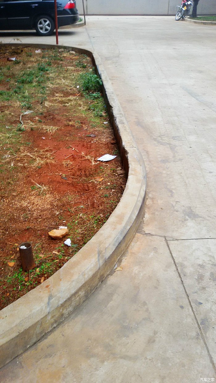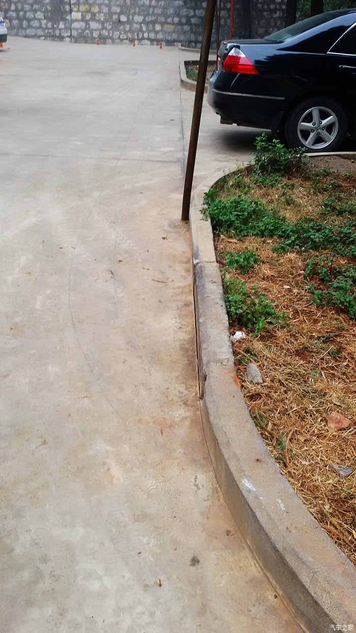 9,第九眼:从下图中轮胎在地面留下的痕迹看:它似乎在进入我身后的绿化带里之前,还绕过了图中这根:小区住户用来拉线晾晒衣物的铁杆。。。。。。