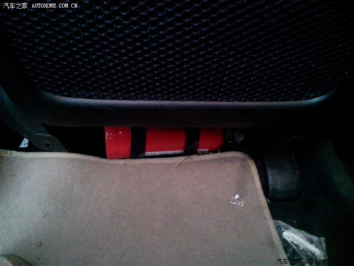 灭火器固定在驾驶座下面。不要太靠里,会影响座椅后移;太靠外,影响后排乘坐。固定方法:到裁缝店买4尺长的魔术贴,只用有钩钩一面,剪成4断,2根垂直绕过灭火器,2根平行。费用:2元。我做过测试,从驾驶座下来拿出灭火器只要4秒。