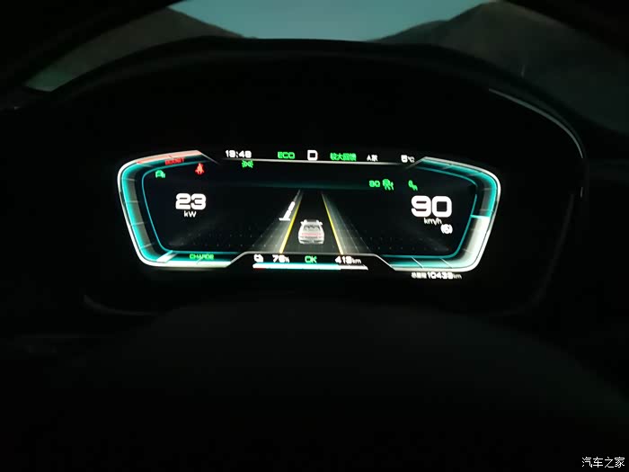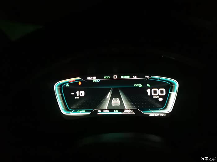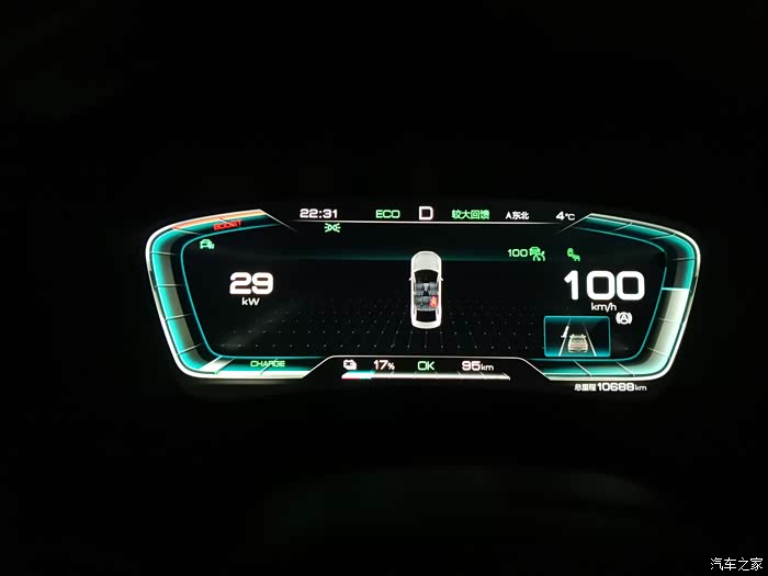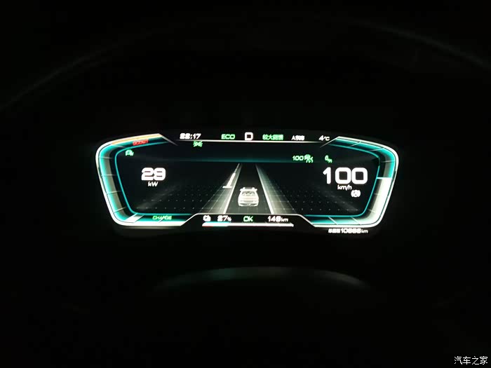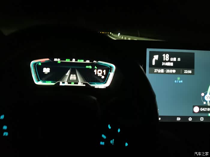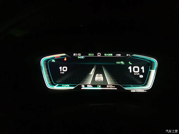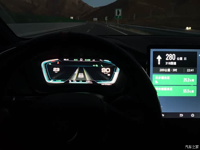 过了米拉山隧道以后,就是开始下坡,下坡动能回收其实不是很大,因为高速公路的设计,都有一个科学的坡比设定,下坡的坡度不是设定得很大,动能回收始终在10千瓦上下,而且也不是说全程都有动能回收,也有一些是相对平缓的路,这些路也是需要电能去克服风阻,而且我们晚上走,风的方向和白天是不一样的,我在车上明显感觉是逆风行驶,车顶行李箱克服风阻的声音特别的大,大得甚至有些吓人,遇到横切风,感觉车子都被吹的摇晃了。