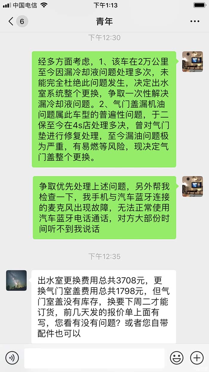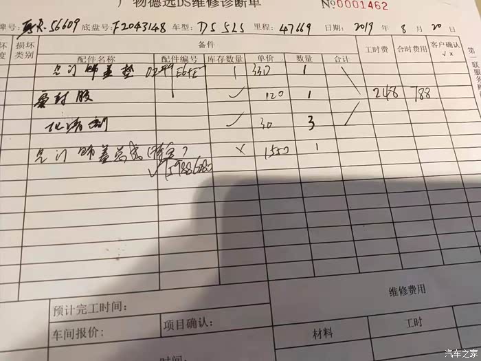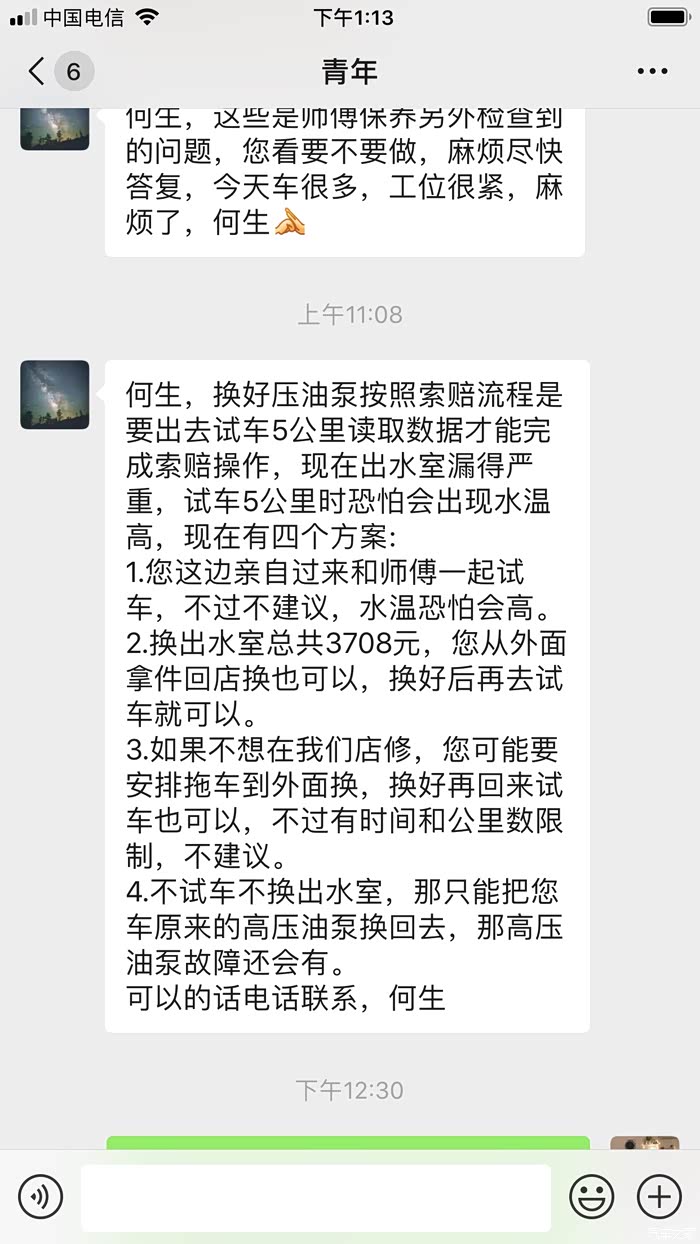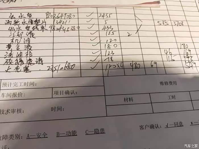 4: 入厂后一系列的检查和费用就出来了,大部分零件要预订,最快提车预计31号,整整半个月,而且只是预计,检查结果为@高压油泵警报需更换@出水室漏水,更换整个出水室系统3708元@气门盖漏机油,建议先更换气门垫700多元,使用过程中再漏再更换气门盖,因上次维修己对气门垫进行处理还在漏,所以这次直接申请更换1798元,以免产生两次费用。