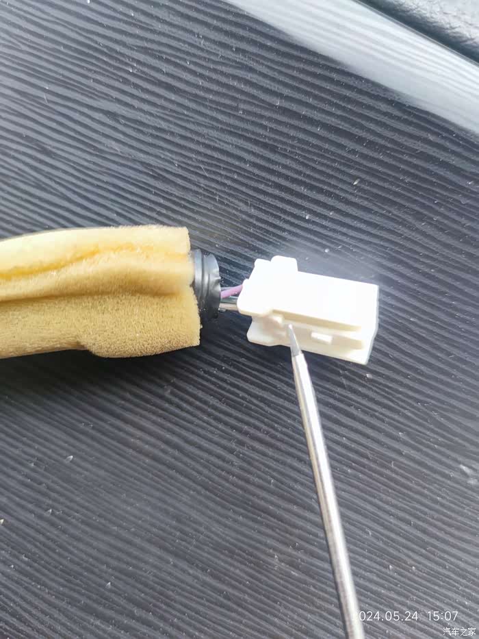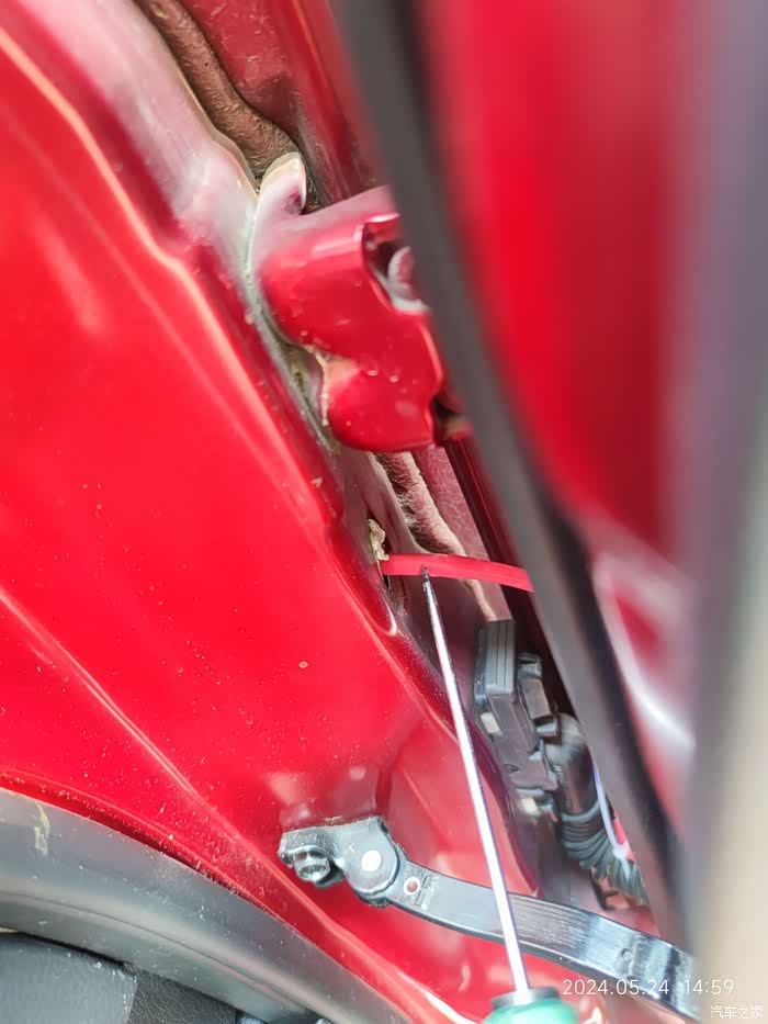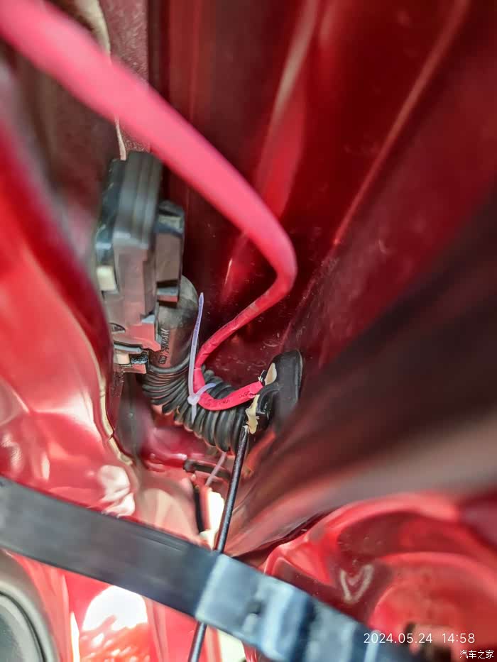 车门摄像头走线孔(怕磨损,自己加套了红色热收缩管)