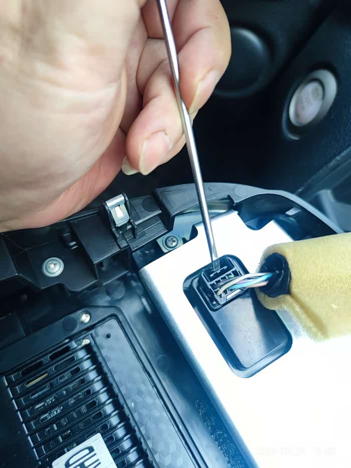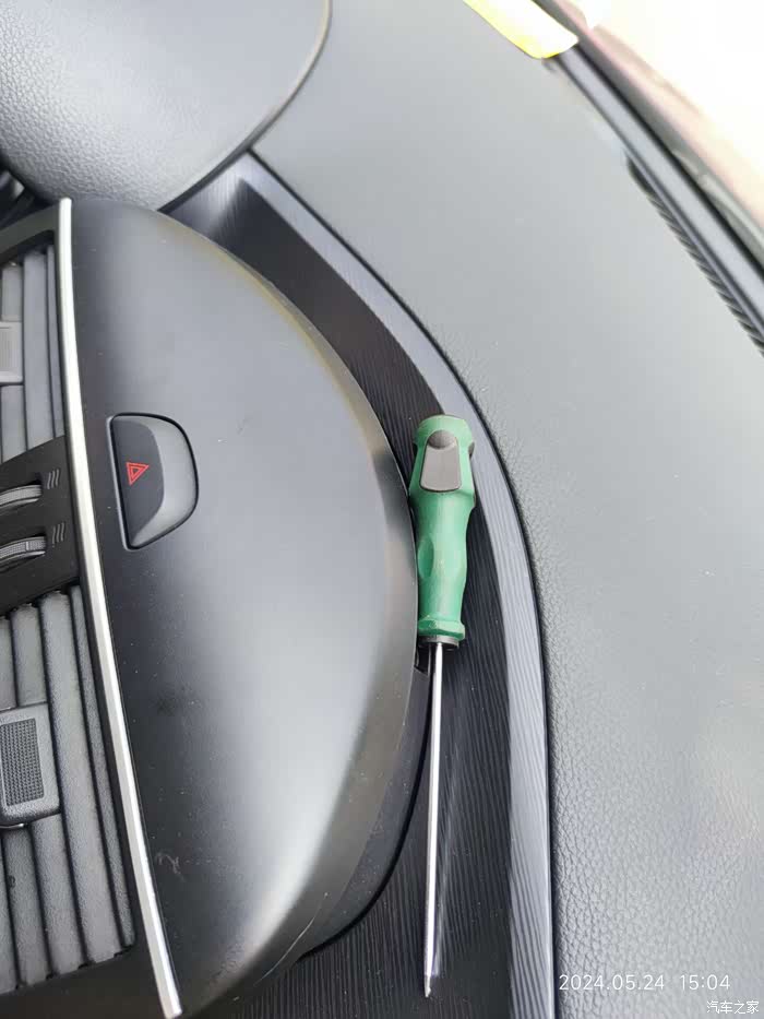 中控(螺丝刀手柄位置)有机关,脑袋使劲往前伸才能看到;有块塑料盖板,取掉,即可看到螺钉两颗,螺钉拆了后,双手扣住螺丝刀手柄凹陷位置,使劲往外扳,即可取掉中控。虽然需要用力,但你别用蛮力,因为里面有插头连线(小心损伤插头连线)
