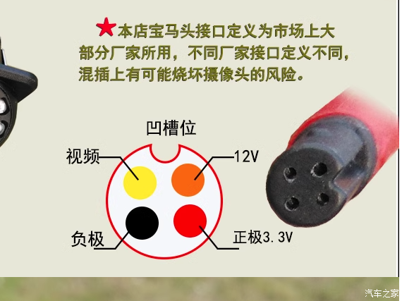我选用的是红外补光的,价格在六七十元,估计二三十元的也能用,接口为莲花接口(我车机是莲花接口),摄像头类型为CCD ,(我车机视频输入只支持CCD,,但倒车接口支持AHD),右侧视频切换方式为中控大屏(AUX)手动切换,也可利用速度上锁功能触发为自动(但我闲麻烦),归纳总结:绝大多数车机选用CCD类型较为稳妥!不差钱就优选索尼225 307之类的CCD摄像头,价格在140到230之间;常用的四针宝马摄像头改装利用见针脚定义图。摄像头供电:中控电源插头取电即可;当前车载摄像头绝大多数3.3V,少数为5v工作电源;市面上卖的车载摄像头一般配有降压器(12V转3.3v或5v);既然是3.3V,我认为取车机5V(U***之类端口供电给降压器),更稳妥(事后马后炮,请验证);关于摄像头或视频扩展可选配件或术语:视频分割器(一屏多画面)、视频切换器(在输入接口不够用时策略)车载录像机.....这些基本一点就通,自行琢磨!