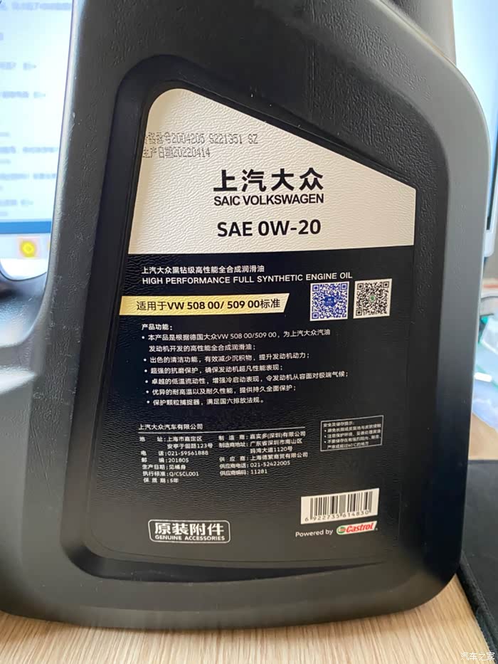 这是大众国六高端的机油, 卖家说,反正国六B奥迪大众都可以用。这个50800机油有几个厂做,这次买的嘉实多厂。准备换上。车里的是50800奥迪4S黑瓶20蓝油, 才用了2000公里,手痒了,不懂能控制几天。这个黑钻无浊点看起来就是通透啊。