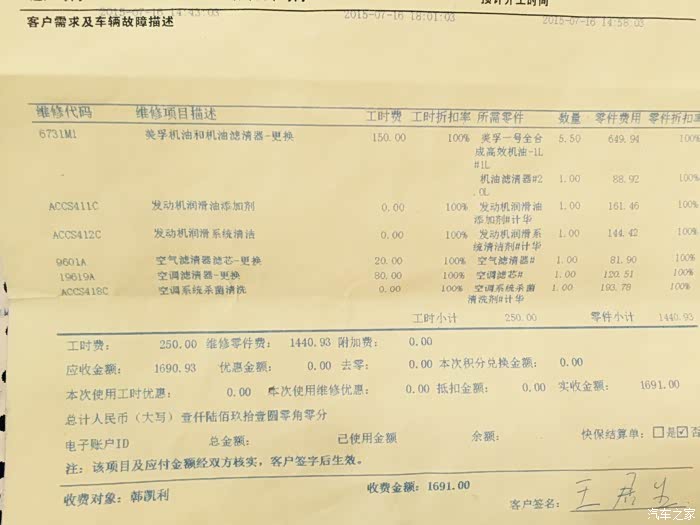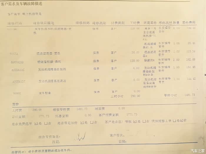 今天是四保了28000公里,费用1771元,包含290元工时费。