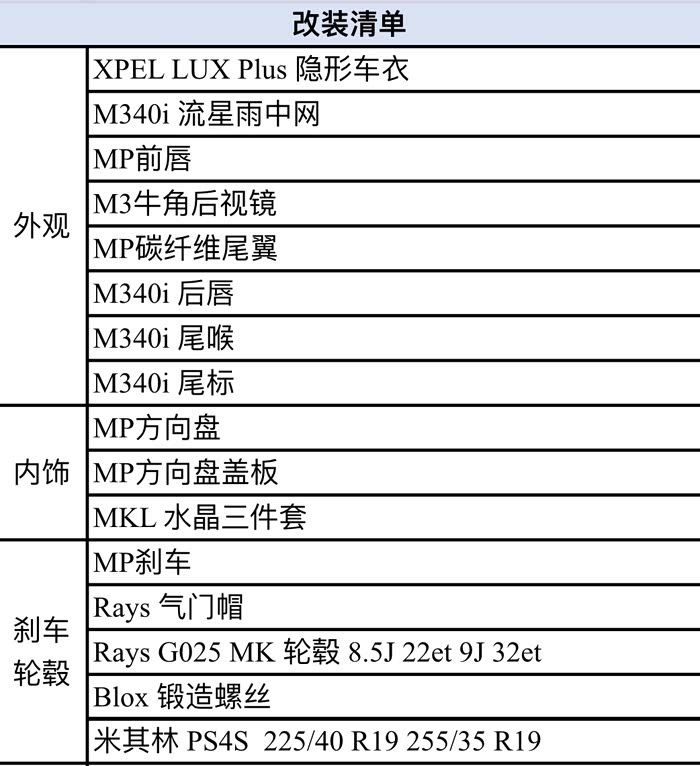 这是目前的改装清单,后续优先考虑KW Le避震和动力升级