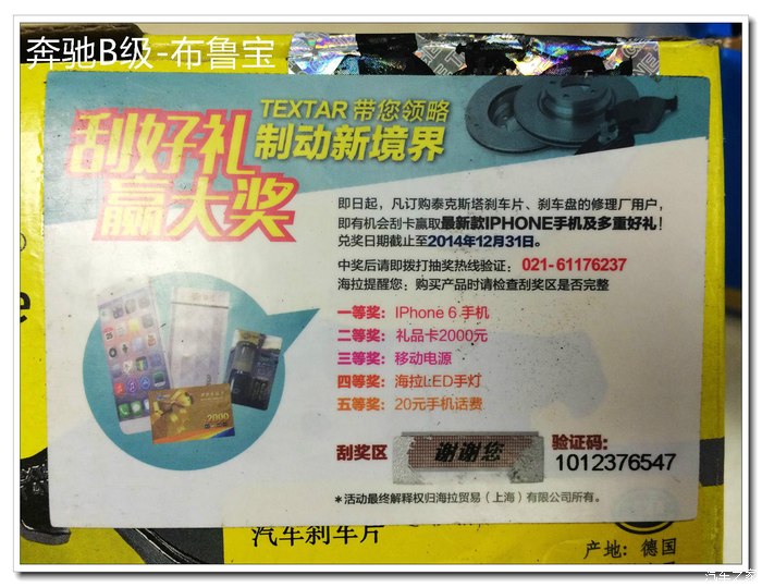 话说上次在利星免费冬季检测,说我的前刹车片磨损的比较厉害,建议更换,我还心里嘀咕是不是4S又在坑我啊,可是没想到三天后行车电脑突然刹车片报警,看来的确要换了。话不多说,正逢淘宝双十一大促,游荡了好久,购物车里放了好几种不同品牌的刹车片,价格从五、六百到一千多不等。最终选择了天猫的这个德国进口的海拉泰明顿的刹车片,价格不算特别便宜,但是制动系统还是不能马虎,关系到咱的绳命安全不是?选择他家也是因为他家刚好有刹车警报线,还是淘宝最便宜的(后来发现多买了一条)。二话不说下单付款,东西很快送到。