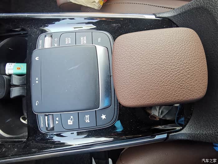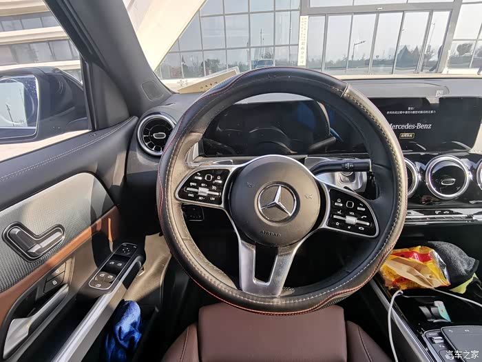 GLB的方向盘为三辐式镂空多功能设计,表面采用真皮包装,握感不错,也不知道那个家伙给我瞎出主意,这不又在真皮方向盘外面带了一个T