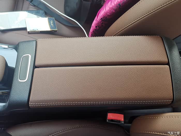 中央手扶箱为最开始表面使用真皮包裹,手感不错,能够有效的为驾乘者提供有力的肘部支撑。