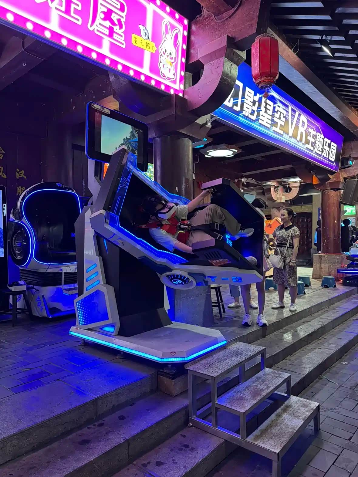 这个就比较现代的了。VR体验馆,这个小男孩再玩过山车呢。