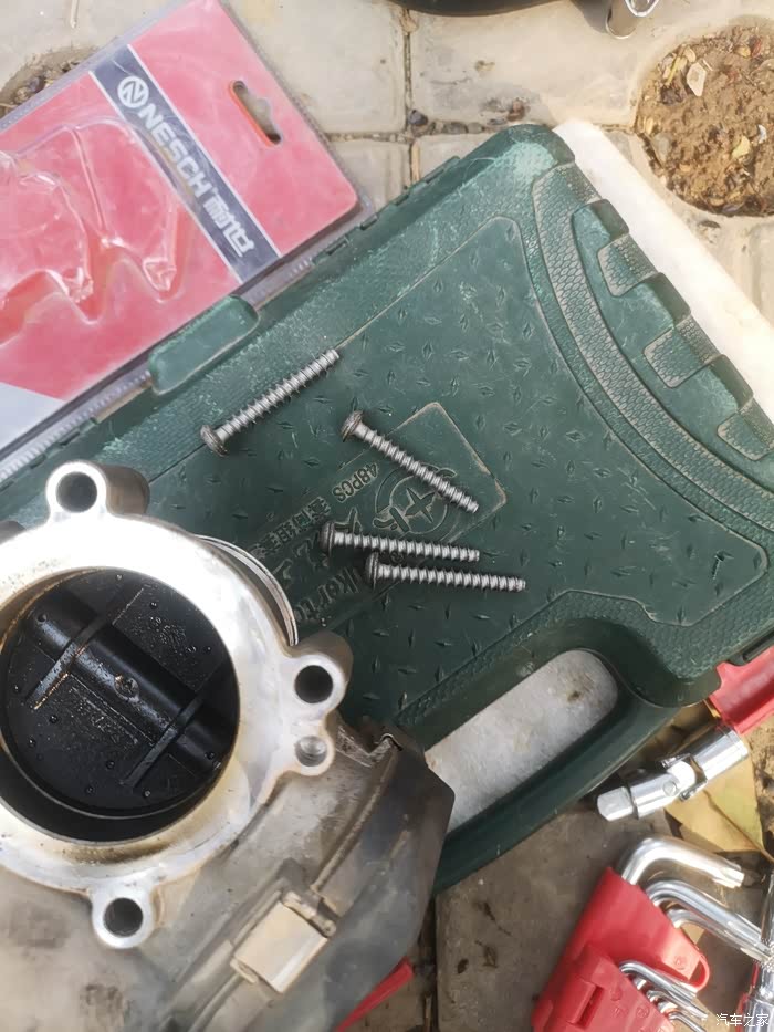 不过这都不是事,考验意志力的时候到了。节气门一共四个T30螺丝螺丝固定,里面两个外面两个。里面的看不到,全靠手摸!建议先拆里面的两个!我拆的时候还出了点小插曲,我用的那种活动的小批头+棘轮扳手拆的。拆里面螺丝的时候批头掉了,怎么都找不到了。。。。就像人生果掉地上一样!!!最后用T25批头的凑合拆下来了!好在这四颗螺丝都不太紧,松动以后用手拧下来就可以了。下图是拆下来螺丝的样子。