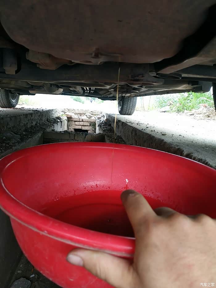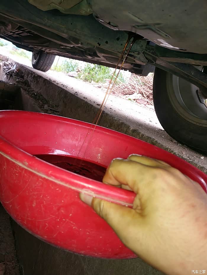 拆下油底壳的放油螺丝。接好盆别撒了,还要计量油量的。