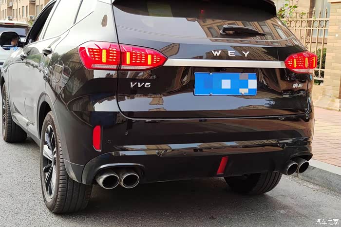 竖条状的尾灯也很有设计感。两个尾灯之间采用了镀铬的设计链条,上面是WEY的标志,整个设计干净利索,没有一点多余之处。车底部两侧各有两个排气筒,设计得很对称,动感十足,从后面看也很气派。