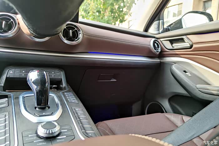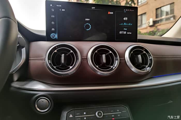 中控屏幕很薄而且足够大,旁边是棕色真皮缝线的皮质,显得很高档。圆形出风口的设计也很有趣。