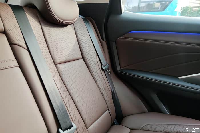 后排真皮打孔座椅既透气又舒服,皮质很柔软。后排空间足够宽敞。