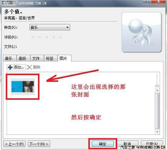 点最后那个“图片”按钮进去,点“添加”选择下载并改好大小的那张专辑封面图片