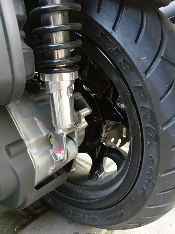 有点儿ADV的鸟嘴的感觉,轮圈台版是枪灰的,个人认为质感比黑的好。轮胎马吉斯,前后大小都还不错,不显单薄。