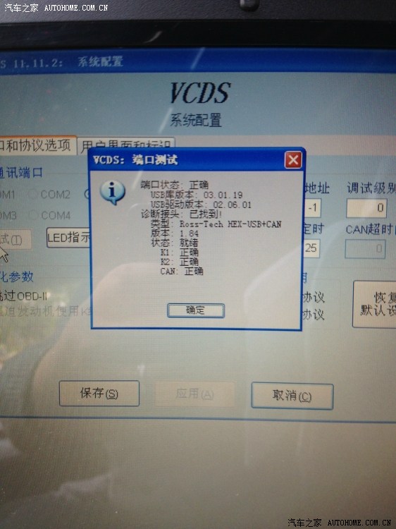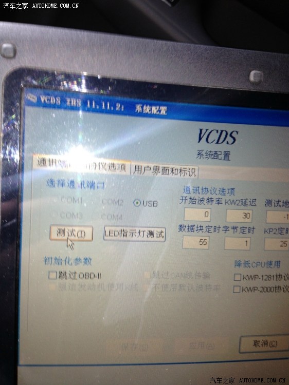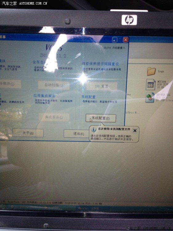 26、另一头USB端连接电脑,打开电脑,打开VCDS程序。注意车子必须是在通电源的情况下,也就是你的钥匙要插上去按一下,不需要发动就可以。如果你担心蓄电池没有电,发动也可以的。然后点击系统配置。