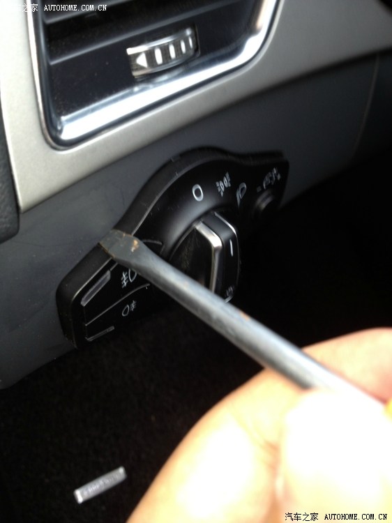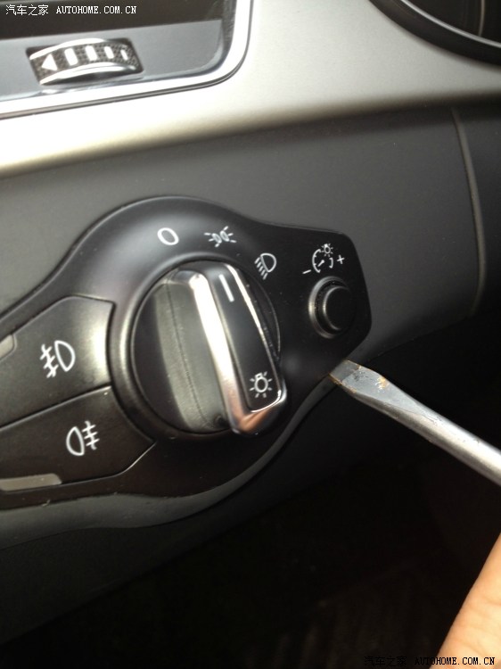 18、开始取旧的大灯开关。取得时候要小心点,不要太用力或用锋利的物品以至于刮坏了旁边的板子,我取得时候由于没有经验就直接用平口螺丝刀撬了,结果边上还是留下了些痕迹。建议大家可以在螺丝刀上馋一两层透明胶布,这样就应该要好很多。先从一侧开始撬,插入后往外轻轻敲。撬出来一点后换另一边。