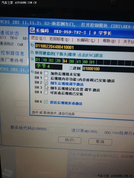 首先前提是要将左门上的调节反光镜开关拧到右边.在右边的反光镜下调后是不会自收会到初时状态,必须车速达到15迈以上才自动收会到初时状态。选择模块---(S)52---编码控制(C)-07---长编码帮助---字节4---BIT2点选