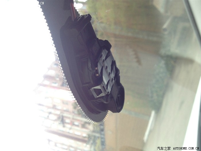 11、然后去下原来的假感应器,它是由左右两侧的卡子卡在上边的,同样用平口螺丝刀撬开一边,就可以了。敲开后通常不会直接掉下来,因为另一面有一层胶沾在玻璃上的,这是你就捏住它左右扭扭,往外拉扯下,几下就可以弄下来了,用螺丝刀撬的时候要注意别把旁边的东西撬坏了。