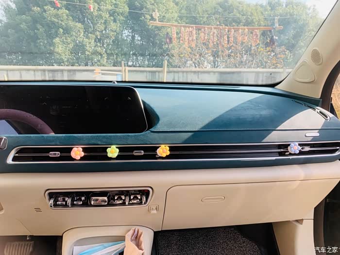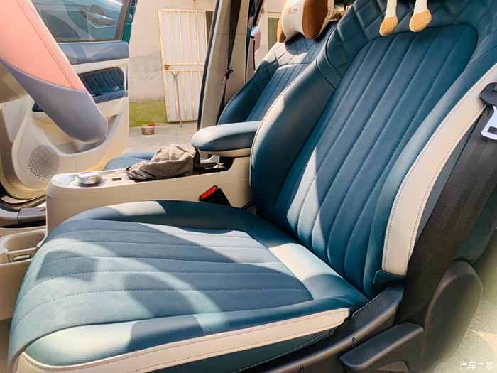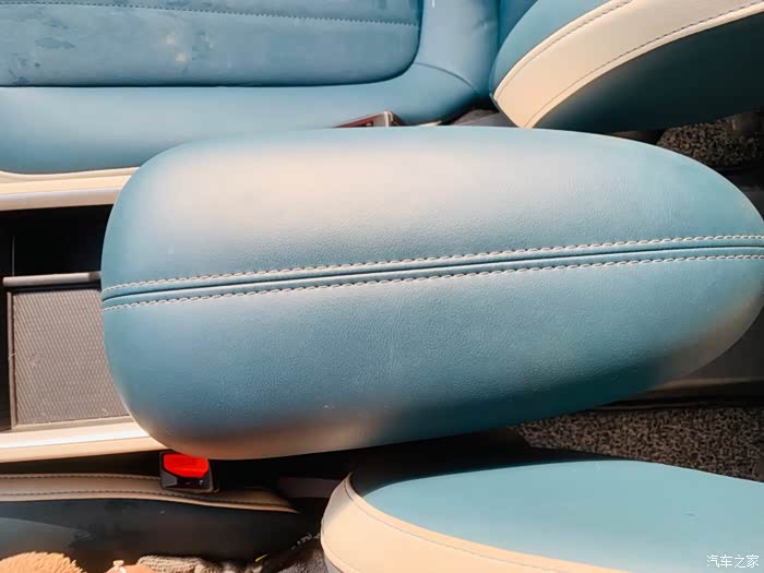 除了车门还有中控台也是绿皮包裹,很平整,这样会觉得比较简洁大方,还有方向盘也是,是绿色和白色相间的(怕脏套了方向盘套)。以及座位,也是覆盖着条纹或菱格纹的绿皮,主要是特别有质感。