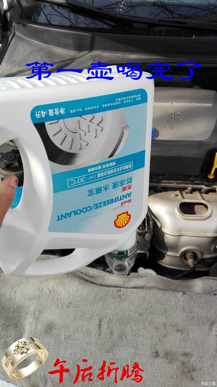 我买的是4L两壶,所以加到最后还剩下半桶。剩下的防冻液保存好,明天早上发车前,必须再次检查防冻液液面,再次添加。就可以了。
