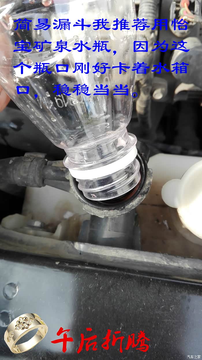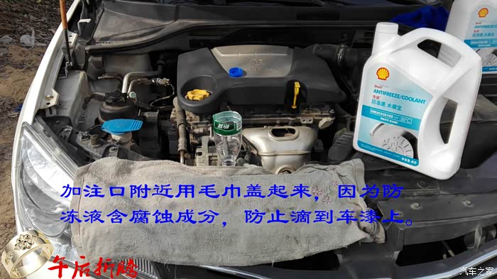 加注新的防冻液时候增加一个漏斗,再用毛巾把加注口盖住,防止防冻液滴在车漆上。