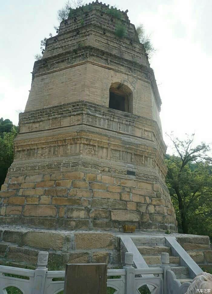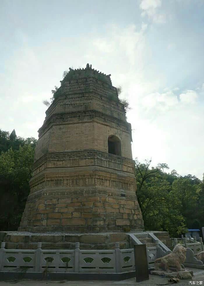 土圣寺右侧是一座高耸的砖塔。这座塔,建于金泰和年间,除石砌塔基和砖砌束腰须弥座外,通身为密檐式砖石结构,由四层组成,各层檐紧密相接,高约15米。相传,建塔是为珍藏释迦牟尼的佛牙和佛骨,故名“灵牙塔”。塔的第一层较高,阴面留置一拱形洞,其中泥塑释迦牟尼佛像一尊,端坐于莲座之上。双手合十,宝相庄严。第二层、第三层周遭全为砖雕小佛像。在高高的塔顶上,设置有铁制塔刹。每层八角顶部均悬有铁制风铃,有风吹来可发出清脆的响声。无论远观近瞧,整座砖塔造型稳健、身形壮伟、雕像逼真,是现存金代建筑之珍品。