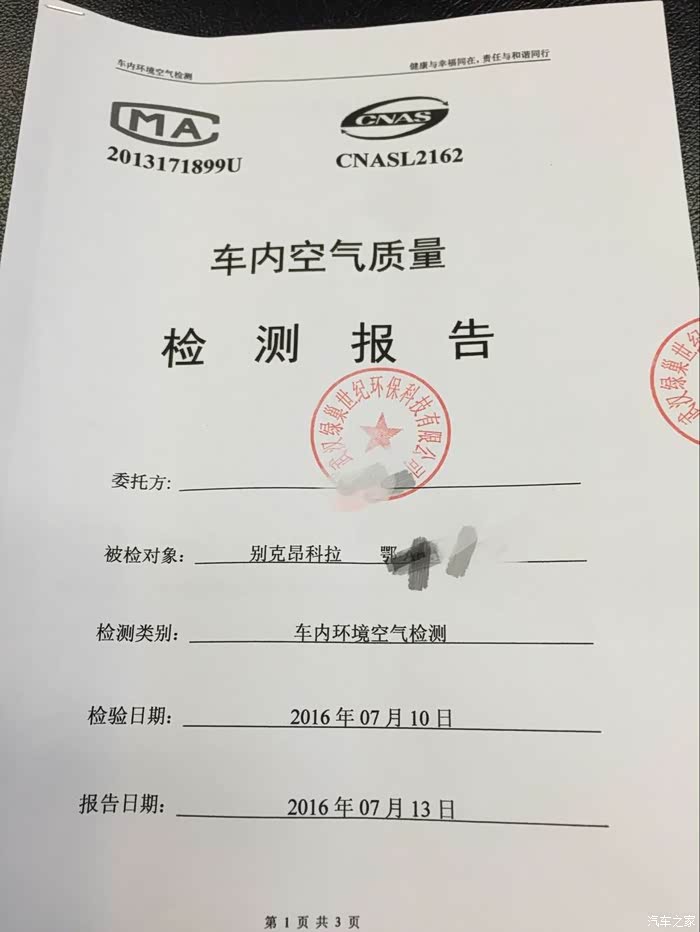 由于工作忙,直到今天才抽空请专业机构给车做了检测。监测时间是2016年6月29日晚上7:45分,车子是大概6点左右开回家的,这段时间武汉一直下雨,今天武汉气温并不高,也就是说不是在最热的时候去测的。