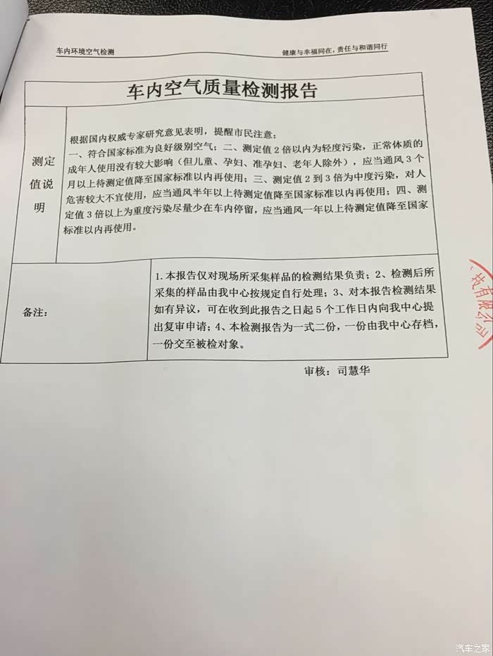 今天再次与武汉恒信4S店沟通,递交了我们的监测报告,4S店说这个是按照室内空气检测标准来执行的,需要按车内空气检测标准来,北京有一家,费用咨询过,一万五!且国家环保部和质检总局颁布的车内空气检测标准指南制定单位中竟然有上海通用!呵呵,看来要投诉就得检测,检测点远在千里之外且费用高昂,基本无法实施,你们和环保等部门真是猫鼠一窝啊!颁布政策又无法落地,检测难,鉴定难!呵呵 我拿的室内环境标准的检测报告虽然不是指定标准,但两个标准的国家最高值是一样的,都是0.1,起码能说明一些问题,开了两年半的车甲醛一定不正常!现将相关报告公布如下,供大家参考!实验室检测结果比现场检测更高,0.36,超标近4倍,鉴定为甲醛重度污染!