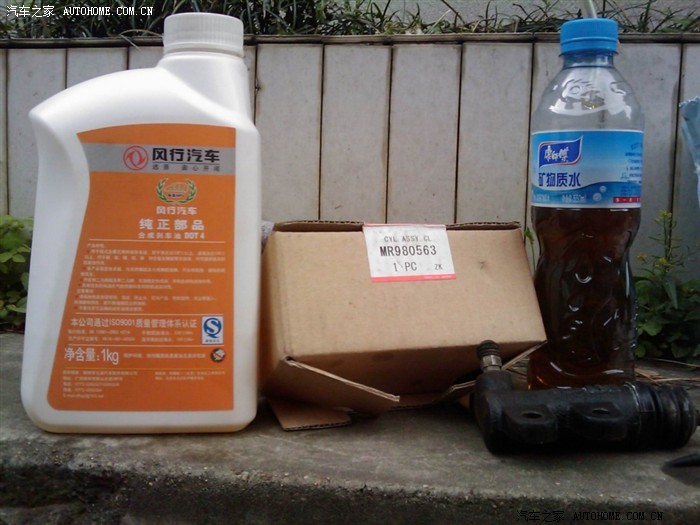 换的过程还是比较简单的,所用的工具:12的套筒,8的开口搬手,还有个特别的,1KG的原厂刹车油,壳牌统一DOT4的。拆的时候要注意,刹车油有腐蚀性,最好要做好保护,先拆下油管,用这个特别的橡胶堵头堵住,要不等你换完分泵,刹车油也流完了。