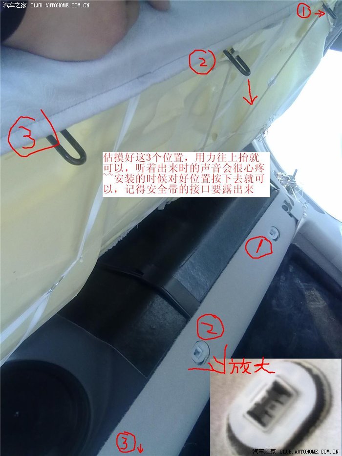 后排靠背,先要从后备箱下手,打开后备箱往里看,固定后排的螺母在隔音棉的后面,座椅附近左右两边各有2个黑色的固定卡子,要取下来,千万别硬扯,卡子类似于膨胀螺丝,把上面的小帽起出来,下面的大的就能拿出来,隔音棉就能拿下来了,为了方便拆螺母,一般要拆8个卡子,左右各4个