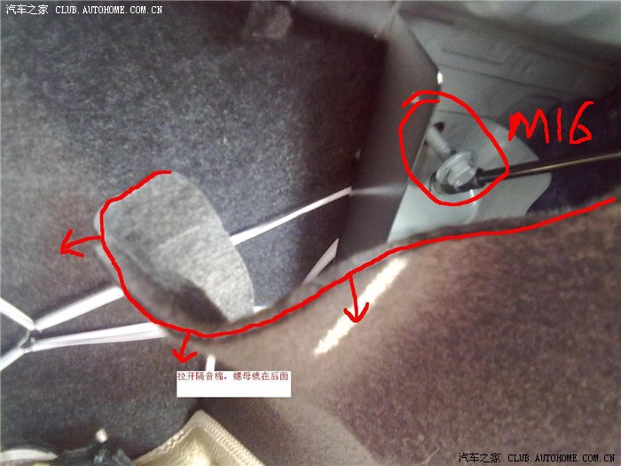 拉开隔音棉就能看到螺母了,16的套筒最好用,用扳手不好卸