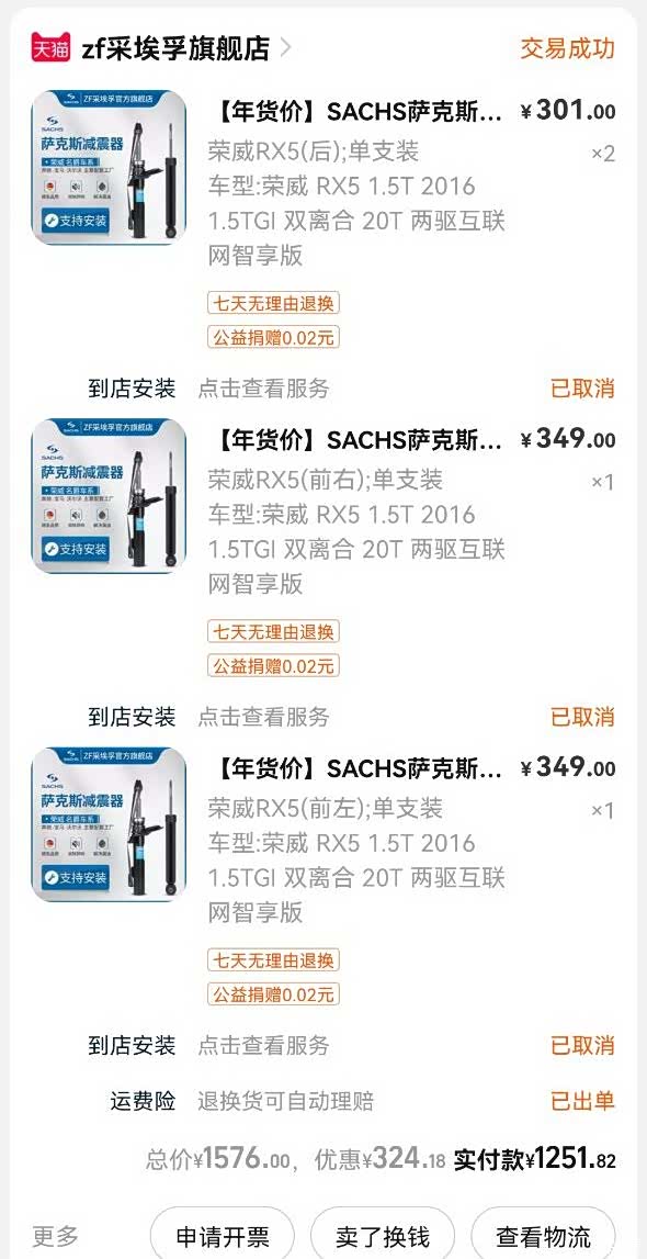 2020年双十一淘的萨克斯减震器终于在今年春节后到货,等了足足3个月才收到货!可等我收齐减震器后,又由于种种原因(懒)一直拖到昨天才想起要去换。询问了多家淘店指定的汽修厂,报价都跟淘店一样是69-79元不等,但细问他们基本没怎么更换过荣威五车型的减震。想着保险起见,还是直接找了四S店,到店报价400元工时费,图个安心吧。