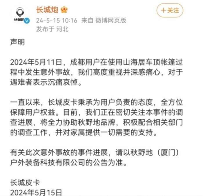 5月15日,长城汽车旗下长城炮品牌官方微博发布声明,声明表示将会协助秋野地品牌,积极配合相关部门进行调查工作,同时将会对死者家属提供一切需要的支持。根据这份声明我们可以明显察觉到,长城炮官方是在有意将责任推卸到秋野地品牌身上。