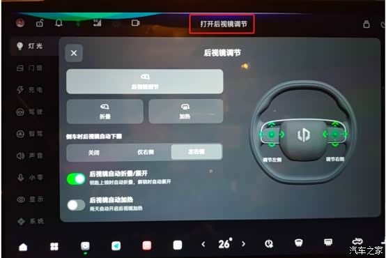 方法一:语音呼叫小零,然后说“打开后视镜调节”,即会出现后视镜调节的界面,界面的左侧部分可以实现后视镜调节、折叠、加热以及倒车时后视镜自动下翻的设置;右侧部分指示了对应方向盘上的左右滚轮所对应后视镜的调节位置。以左侧后视镜为例,只需调整方向盘上的左边滚轮按钮左右上下,就可以调整外后视镜的位置,直到调整到适合自己使用即可。