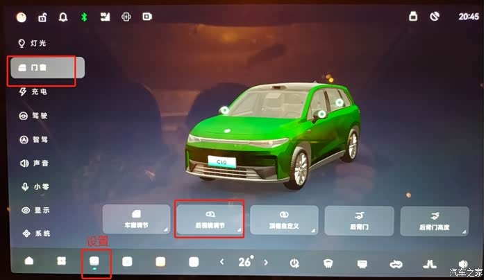 方法二:点击中控屏设置——门窗——后视镜调节,即可打开如方法一中的界面,即可进行相应的调整。