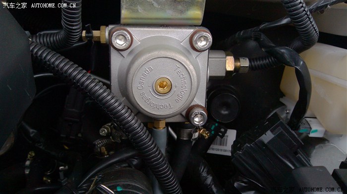 泰德的减压阀,用六角扳手可以调节压力。上面连接了好多管路,在进车里的两根暖水管上接了三通,发动机冷却液要流到减压阀里为燃气加热,所以冷却液温度达不到50度,是不烧气的(这个温度可以通过电脑调整,听说夏天可以调到30度,启动车就烧气)