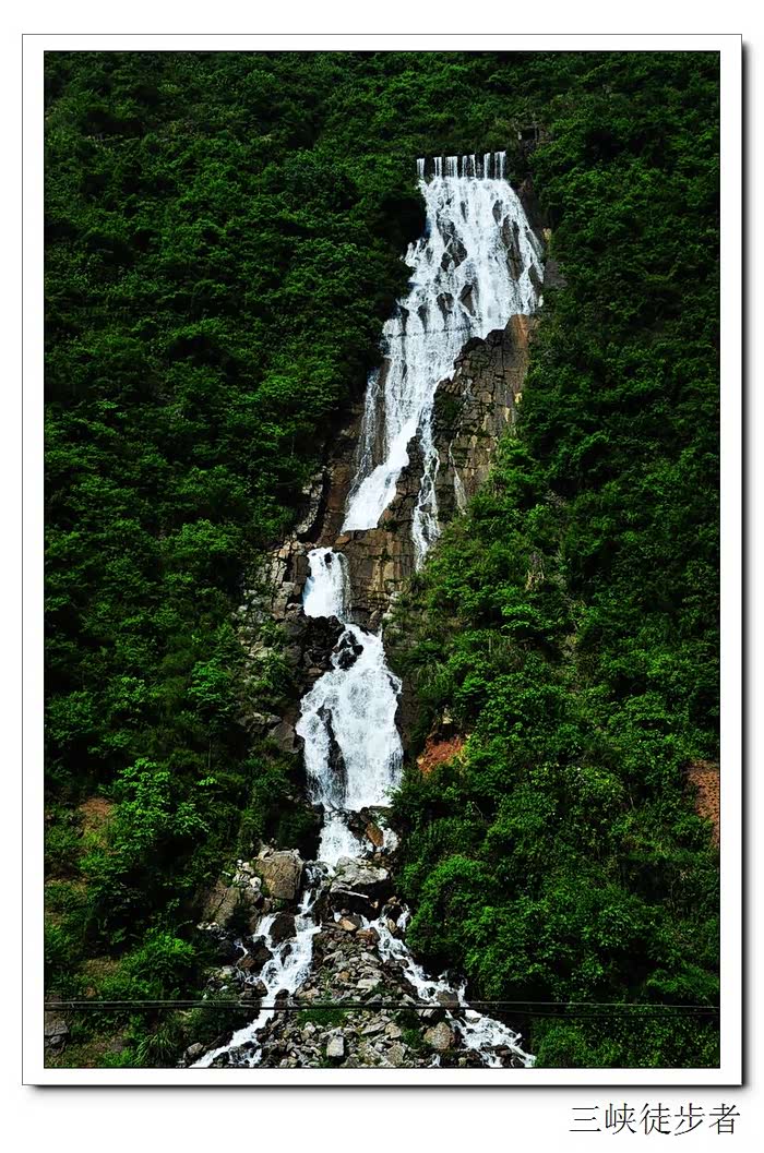 这就是鱼泉瀑布,因其源于南山一洞穴内有鱼,鱼泉瀑布故而得名。据说瀑布泉水有70米高,从一岩坎上急剧垂直下跌,坠入神农溪中。