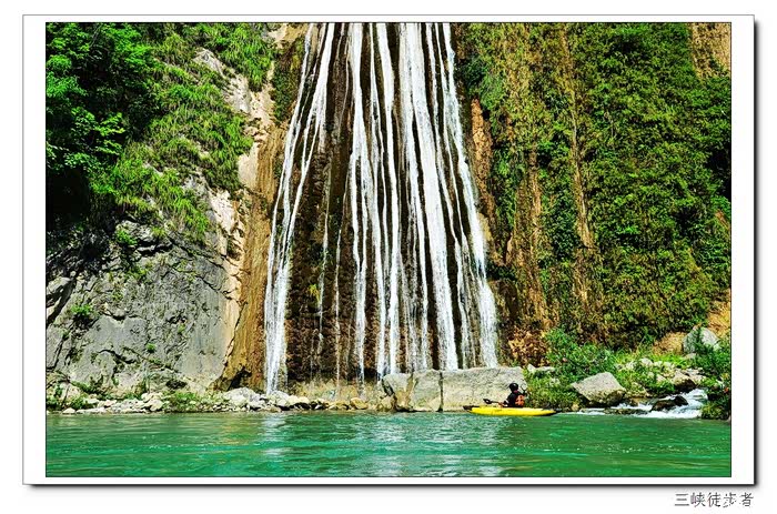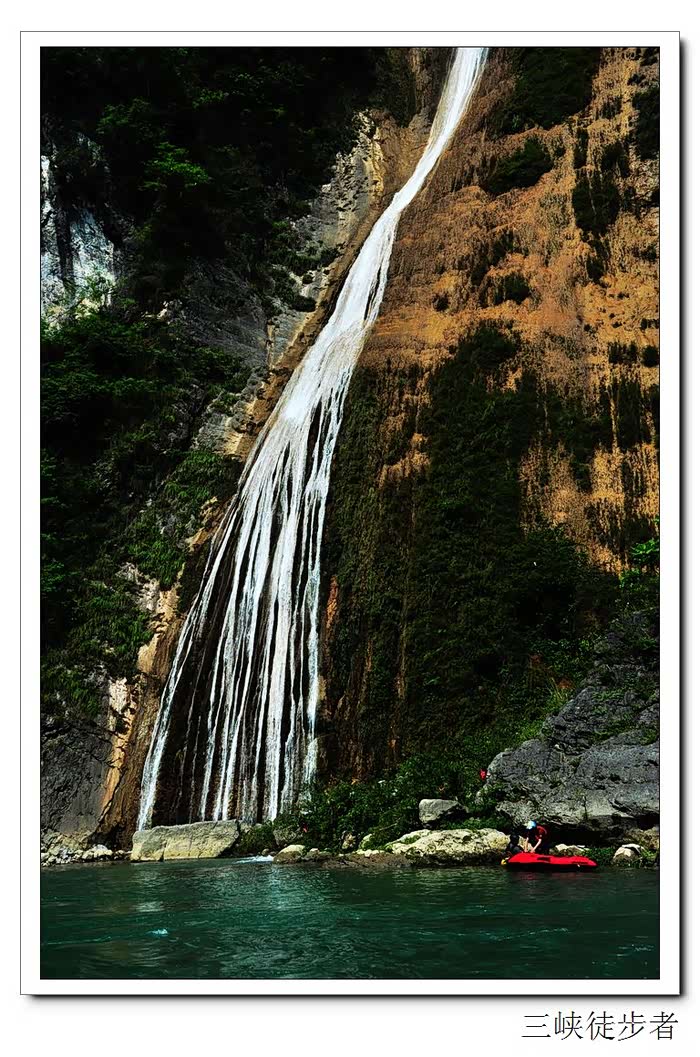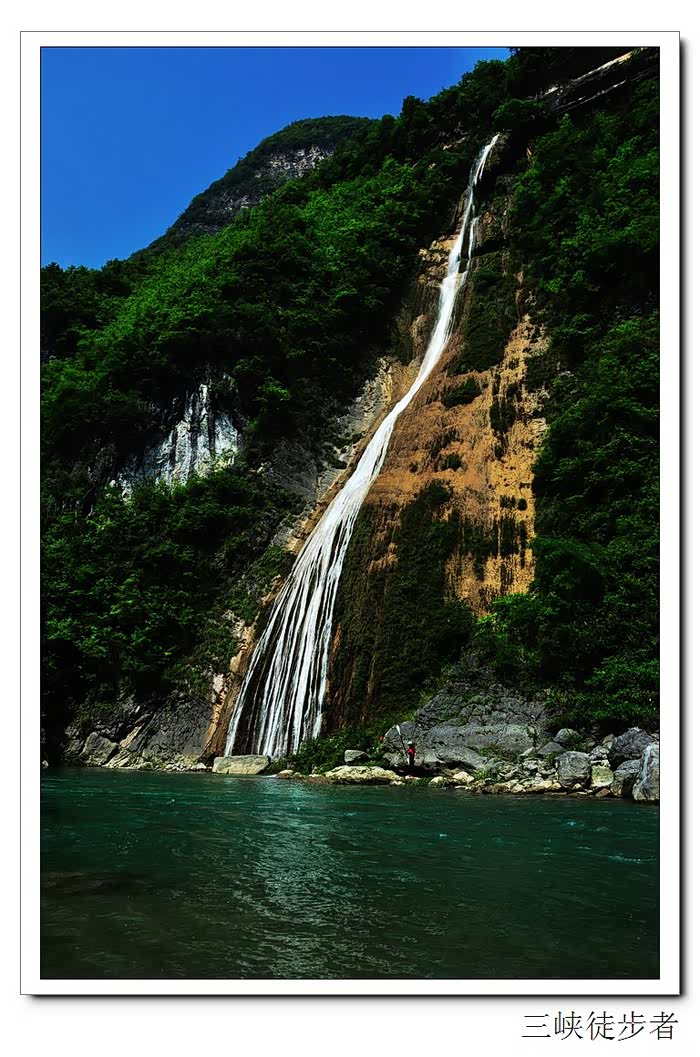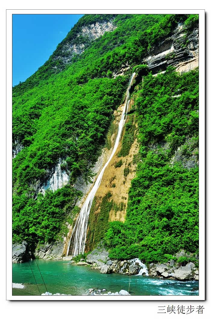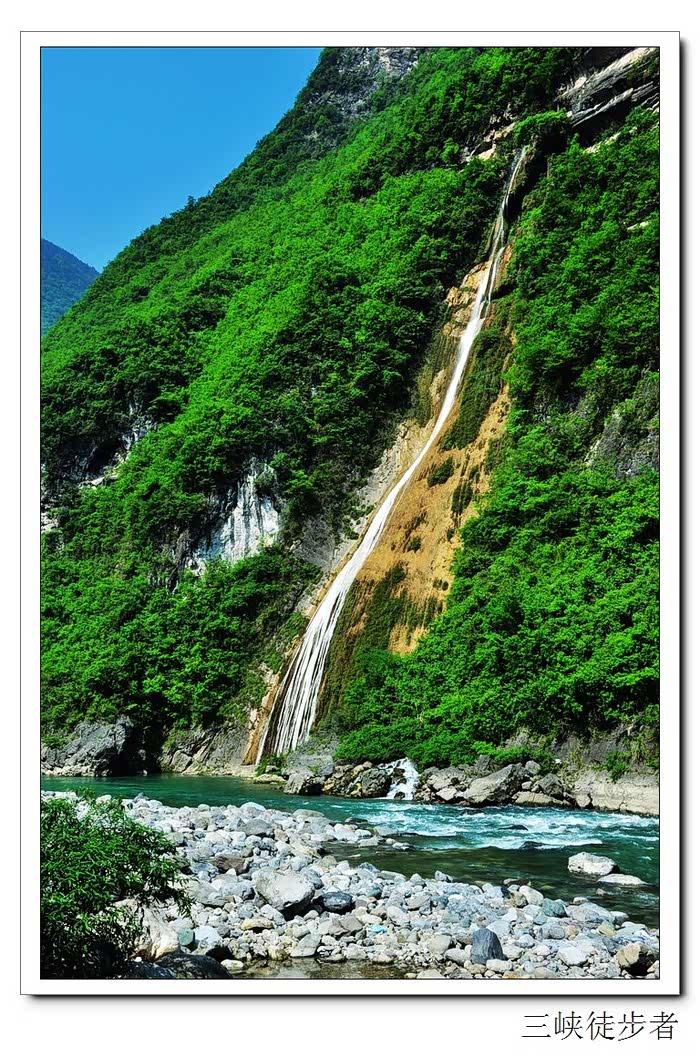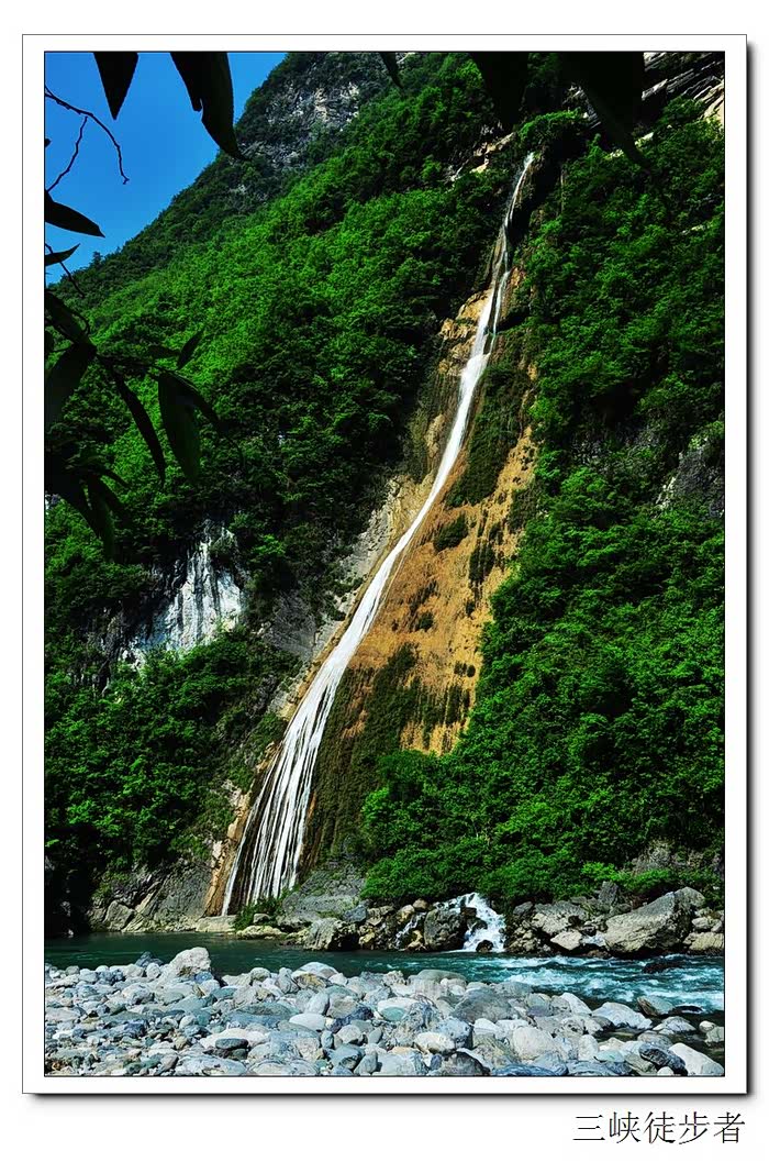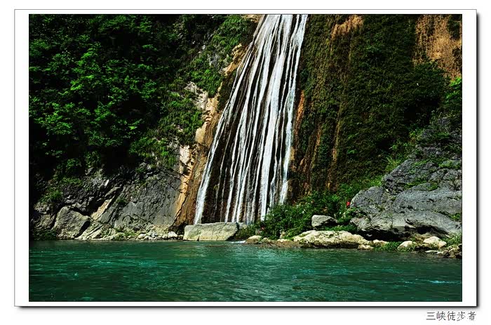 神农溪水犹为清冽,我没看到游鱼,但石籽可粒粒数得清楚,从山顶飞流直下的瀑布,远远望去,瀑布飞注,宛如白练当空,丝绢抖动,这真是再天然不过的美景了!