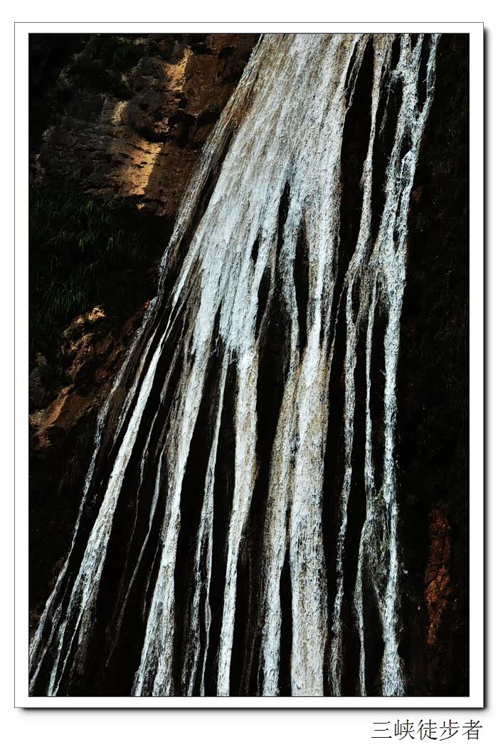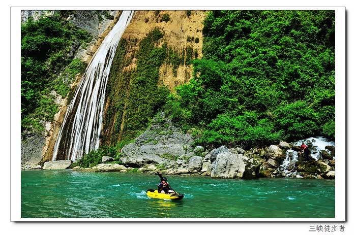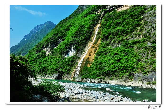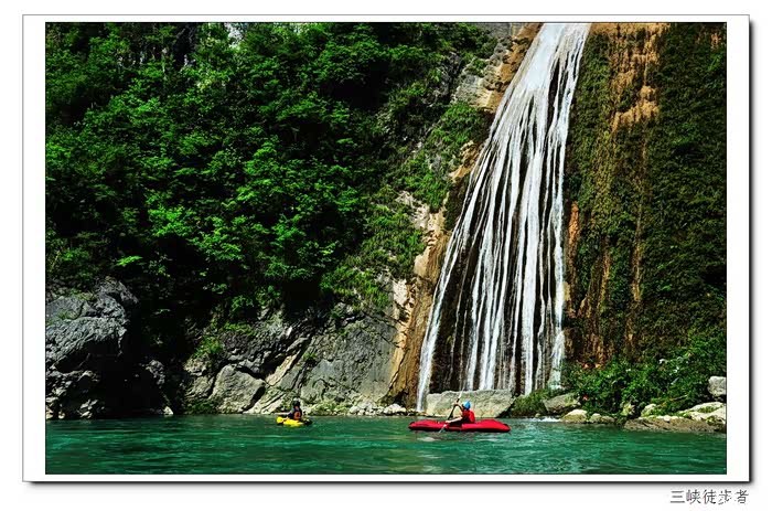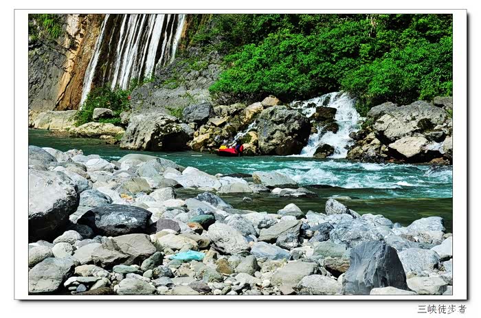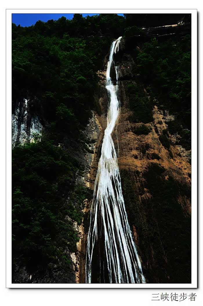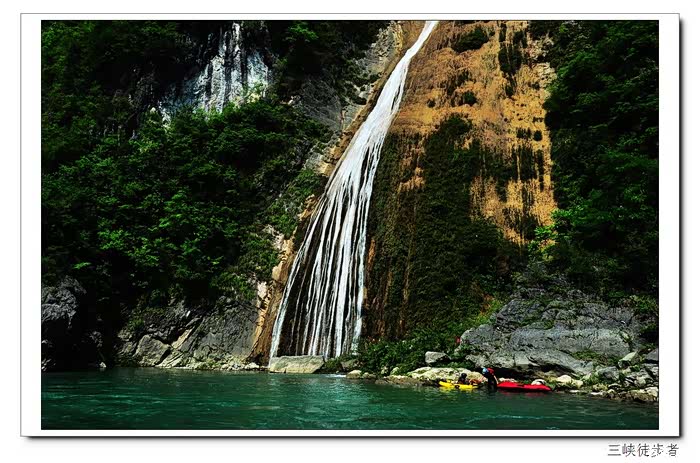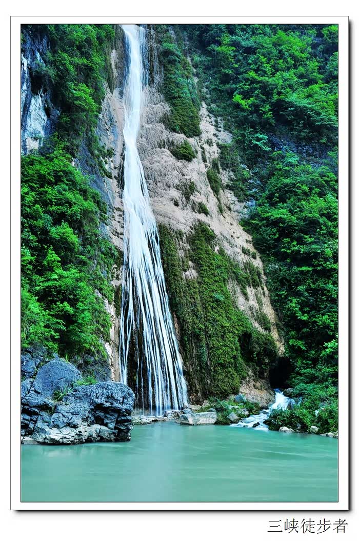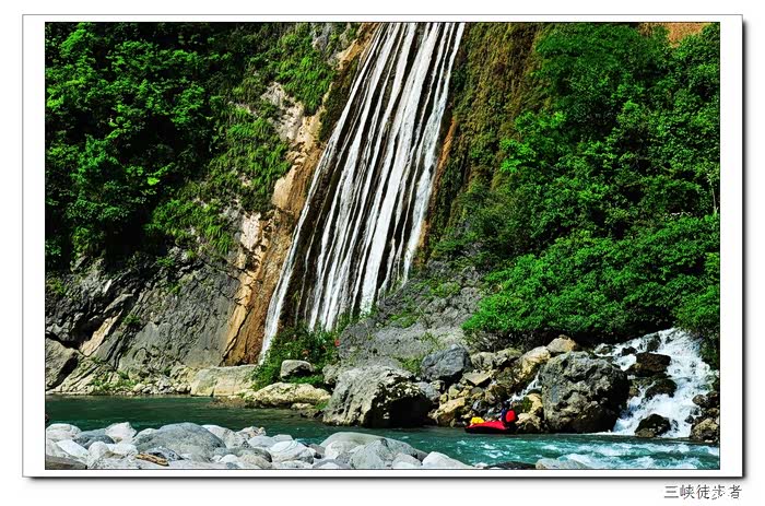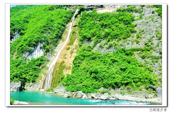 神农溪水犹为清冽,我没看到游鱼,但石籽可粒粒数得清楚,从山顶飞流直下的瀑布,远远望去,瀑布飞注,宛如白练当空,丝绢抖动,这真是再天然不过的美景了!