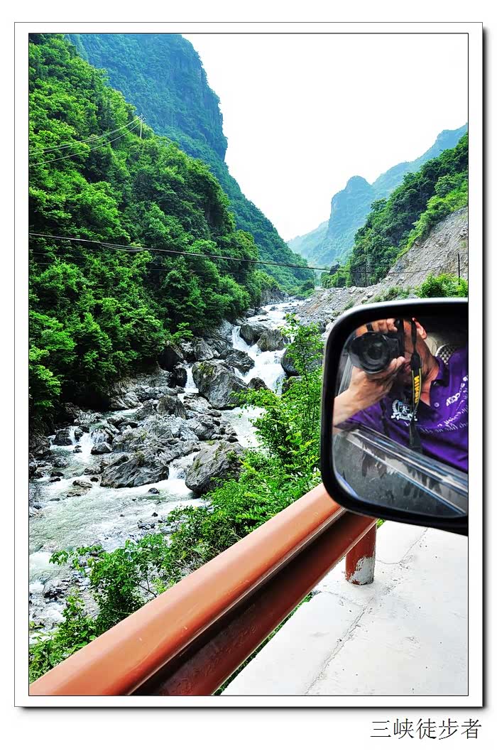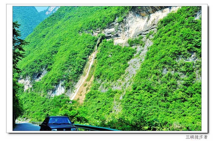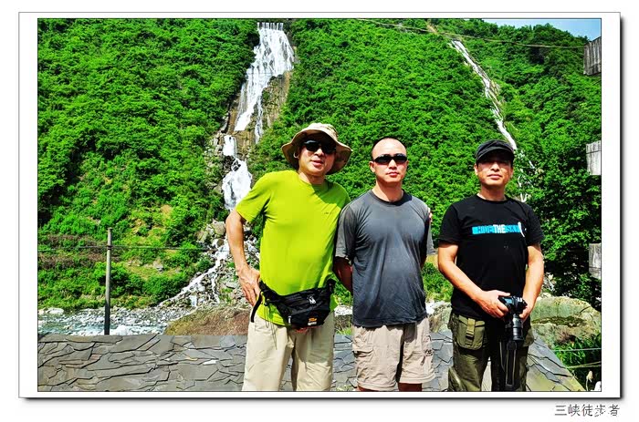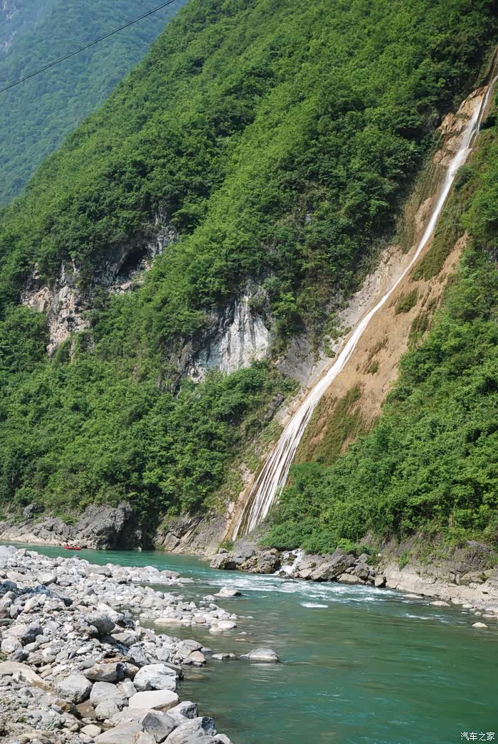 傍晚时分,我们按计划到达了神农溪的二河口。神农溪水边的一条悬挂在半山腰的银色瀑布一下子吸引了我们。我们停下车在这里拍照。