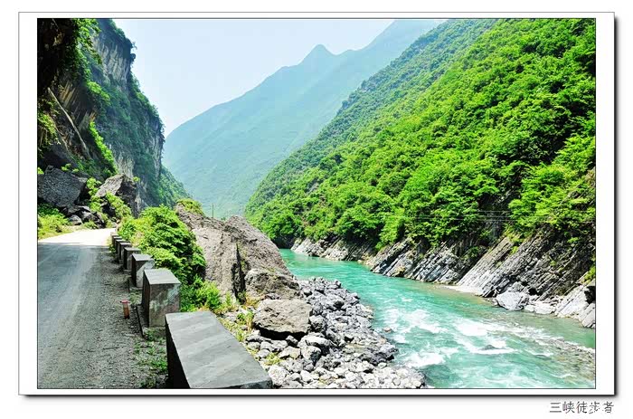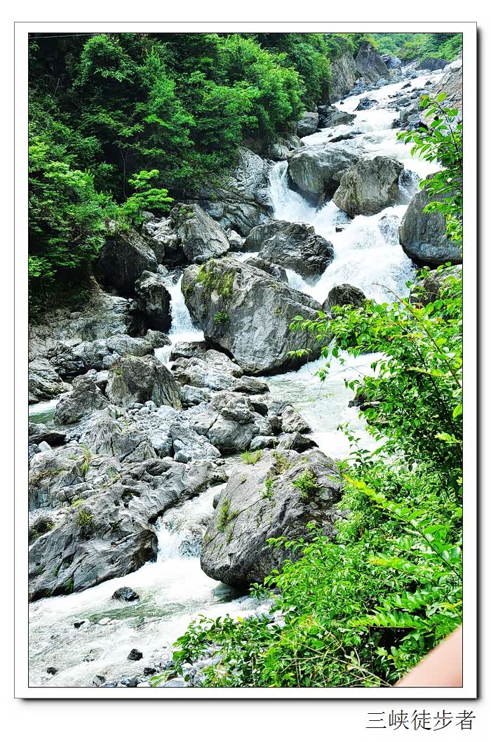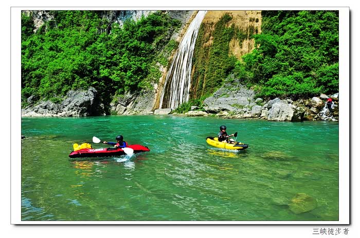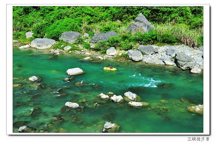 在这里我们好像进入了太古时代的境界,这里人烟稀少,静得出奇。河道蜿蜓曲折,滩险潭多。两岸陡壁夹峙,竹木苍郁,古藤盘结,但见绝壁间有鹰鹞搏击,洞穴中有燕子翻飞。最使我叹为观止的是,在这里放舟中流,宛如置身于激流险滩之中、流泉飞瀑之下,飞溅的溪水可洗去你所有的忧愁和烦恼,使人的灵魂净化于涛声浪花之中。小船时而平缓,时而陡落,时而直行,时而急转,真可谓冒险和平安同在啊!