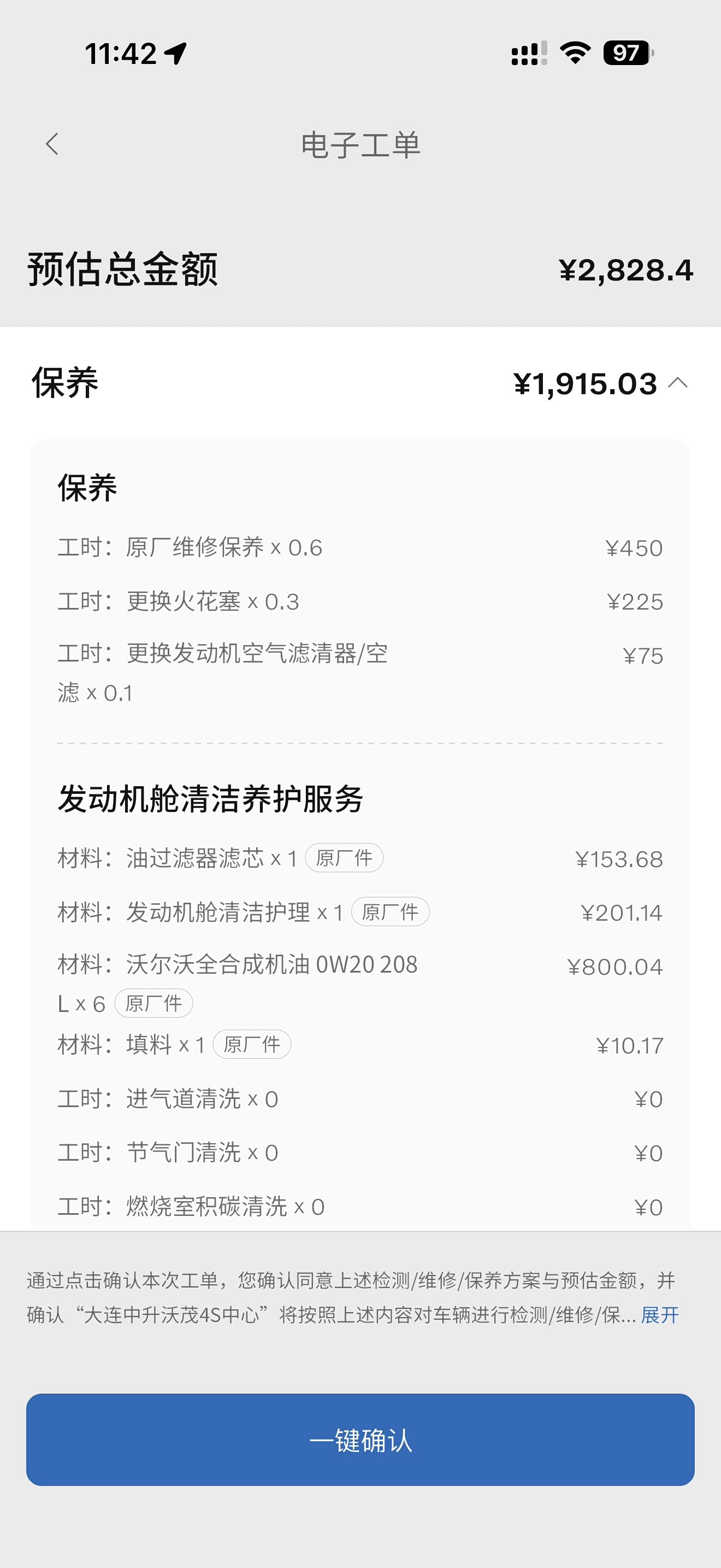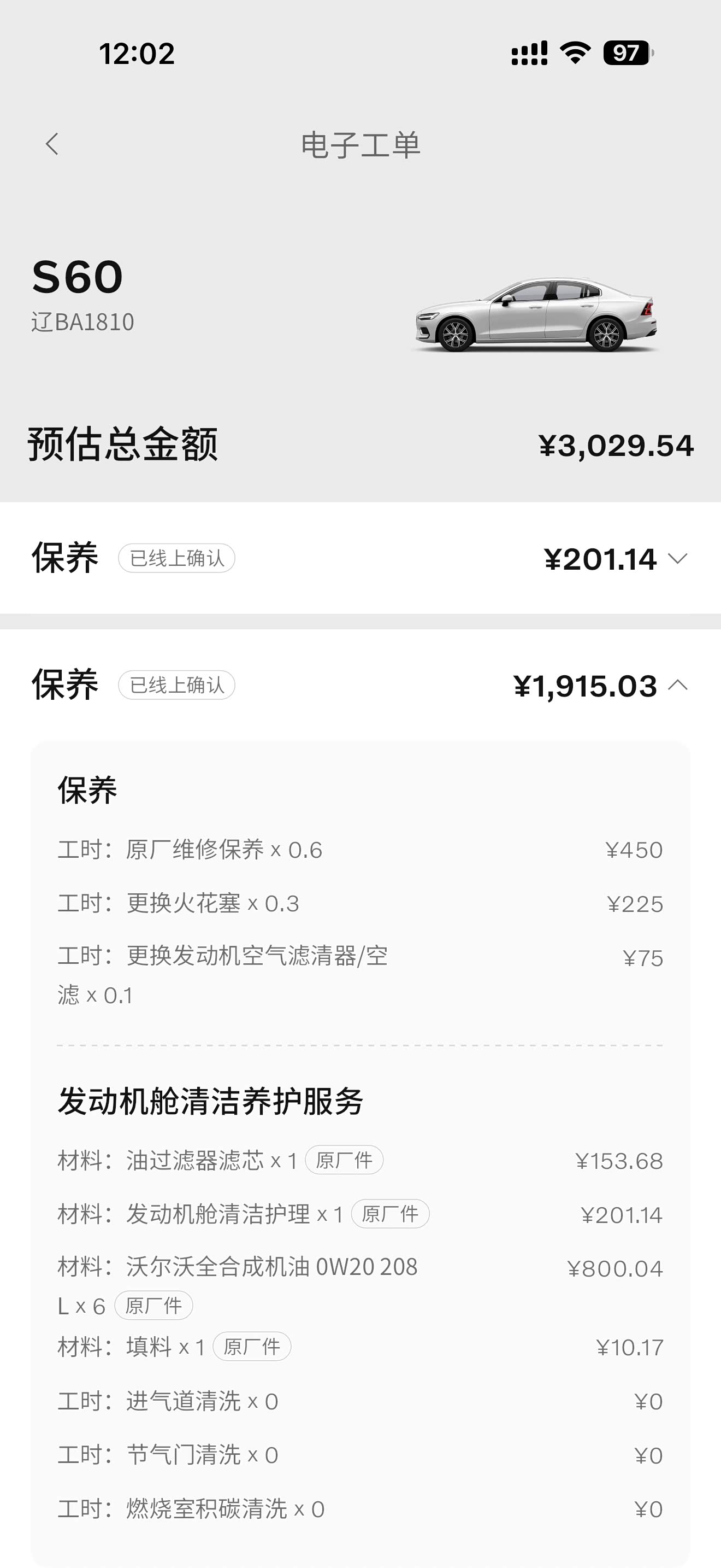 沃尔沃的保养在豪华品牌中一直以“透明”著称,但费用并不算低廉。根据我的保养记录和了解到的信息,S60在 6万公里时需要进行一次包含机油、机滤、空气滤芯、空调滤芯、刹车油及火花塞等项目的大保养,总费用通常在4000元以上。