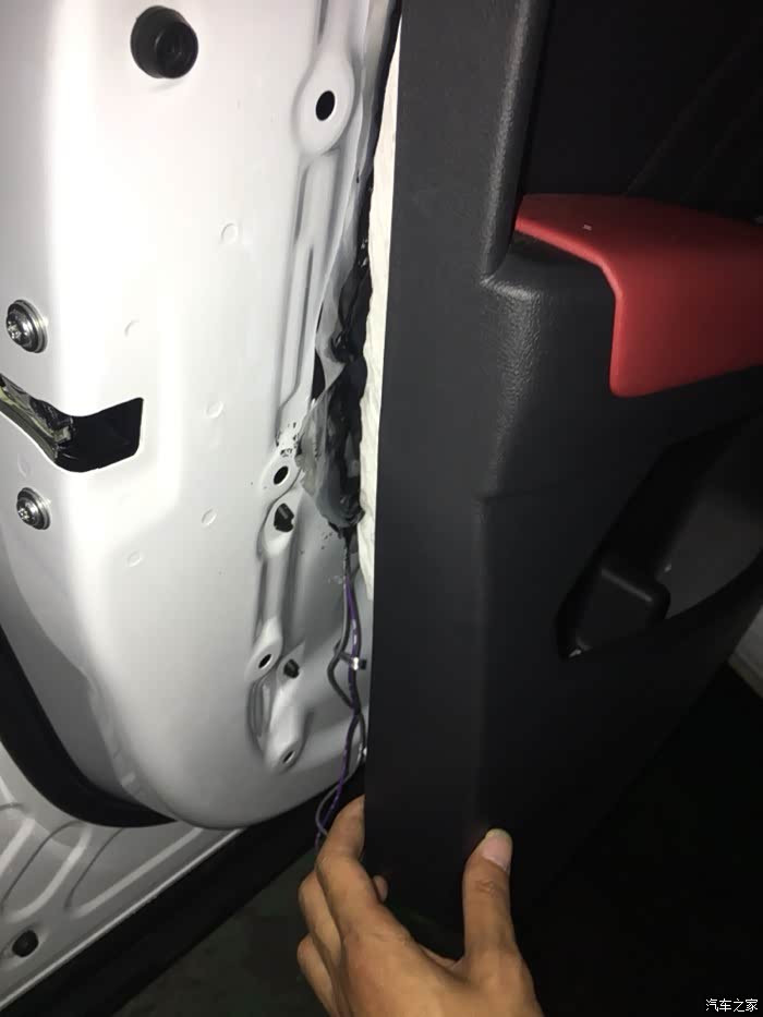 装回车门时,一定要注意。有个门上挂钩。两个接线器。这要接上去。在还原。还原的时候,一共有两个接线器,一个挂钩,还有你改装的两根小线,这些线是链接起的,一定要注意。