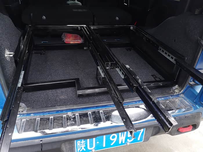 放倒后排座椅,魔盒和座椅之间有25公分的空隙,可以把木板向前推,直到顶住座椅(这就是为什么要改造轨道的原因)
